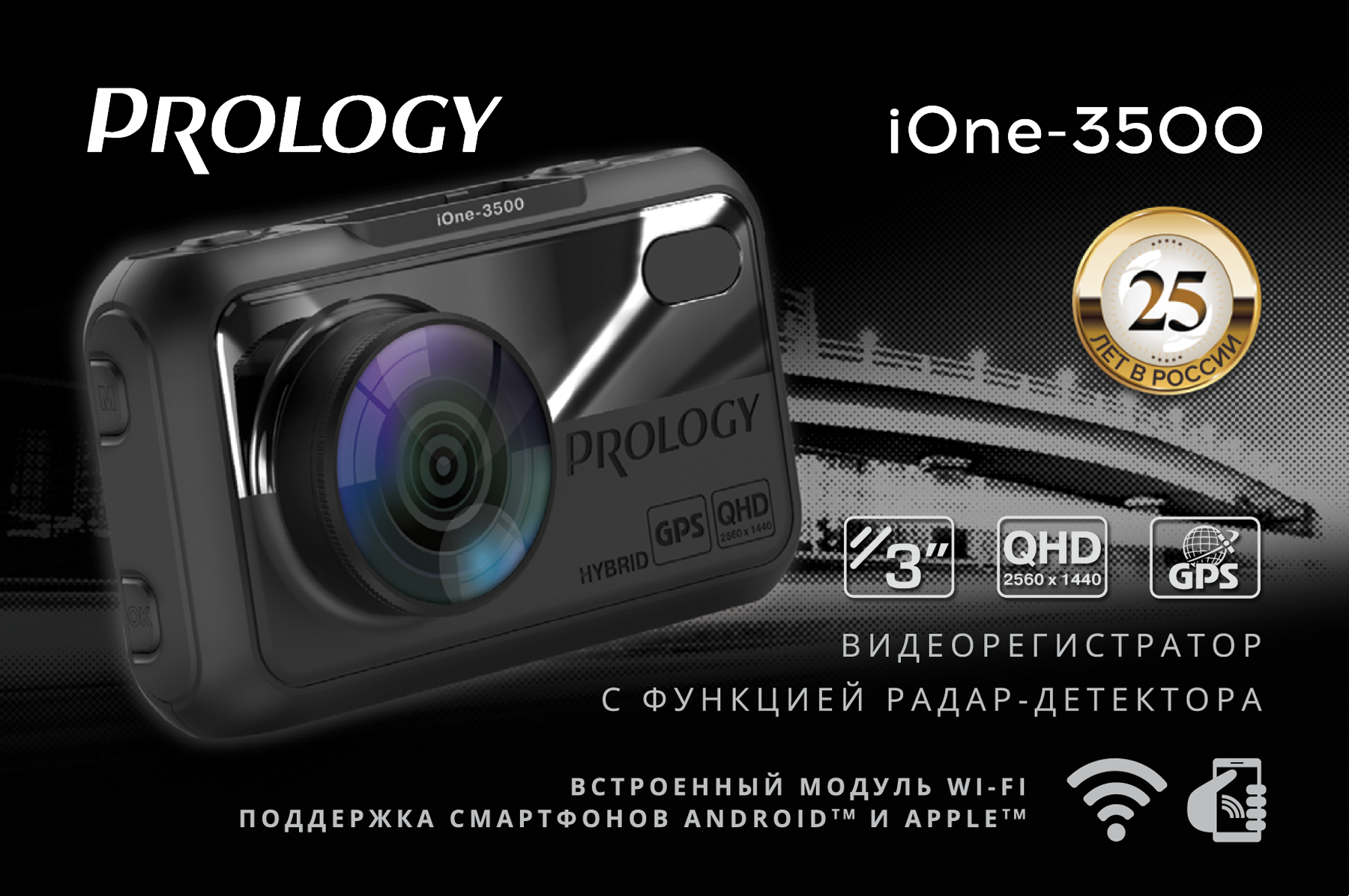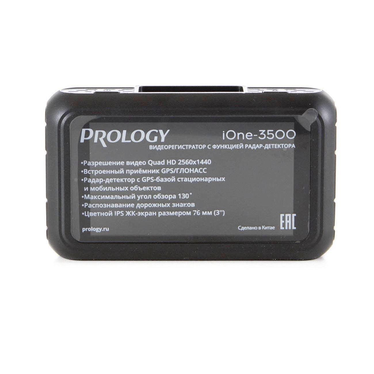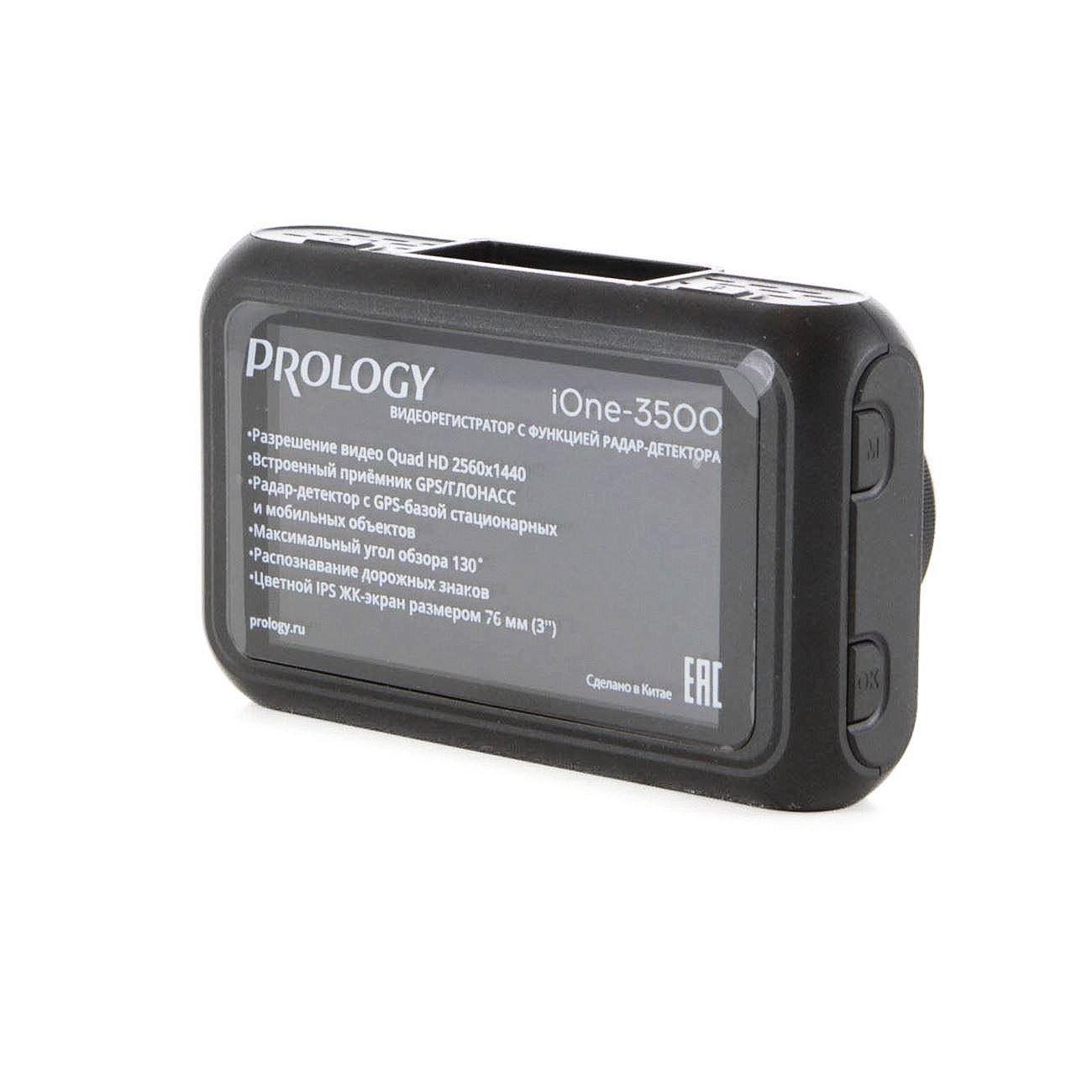 Видеорегистратор c радар-детектором (антирадаром) PROLOGY iOne-3500 предназначен для записи на карту памяти microSD звука и видеоизображения дорожной ситуации из автомобиля, а также для оповещения водителя о том, что автомобиль находится в поле действия лазер-радарных измерителей скорости движения, радарных комплексов «Стрелка» и радаров, излучающих радиоволны в диапазонах X, K, ST и Laser. Встроенный радар-детектор поддерживает режимы детектирования: Сигнатурный → Авто → Трасса → Город. Кроме того, устройство способно оповещать о приближении к стационарным радарам, камерам наблюдения и другим объектам видеофиксации с помощью систем GPS и GLONASS. Устройство легко и удобно крепится на лобовом стекле при помощи магнитного держателя.