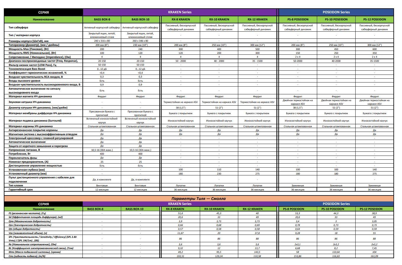 Сравнительная таблица Активных сабвуферов и сабвуферных динамиков PROLOGY